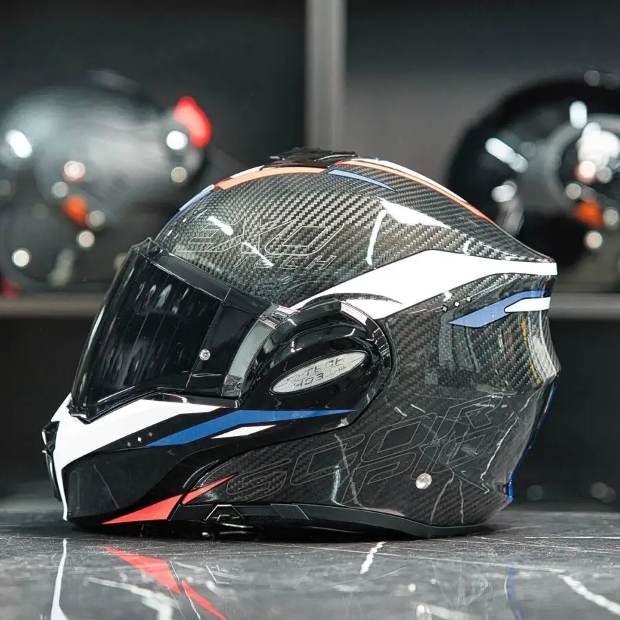 De Scorpion Exo-Tech Evo Carbon Rover in Schwarz-Rot-Blau bietet ein markantes Design mit modernster Technologie. Ideal für Motorradfahrer, die sowohl Leistung als auch Stil schätzen.