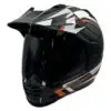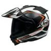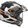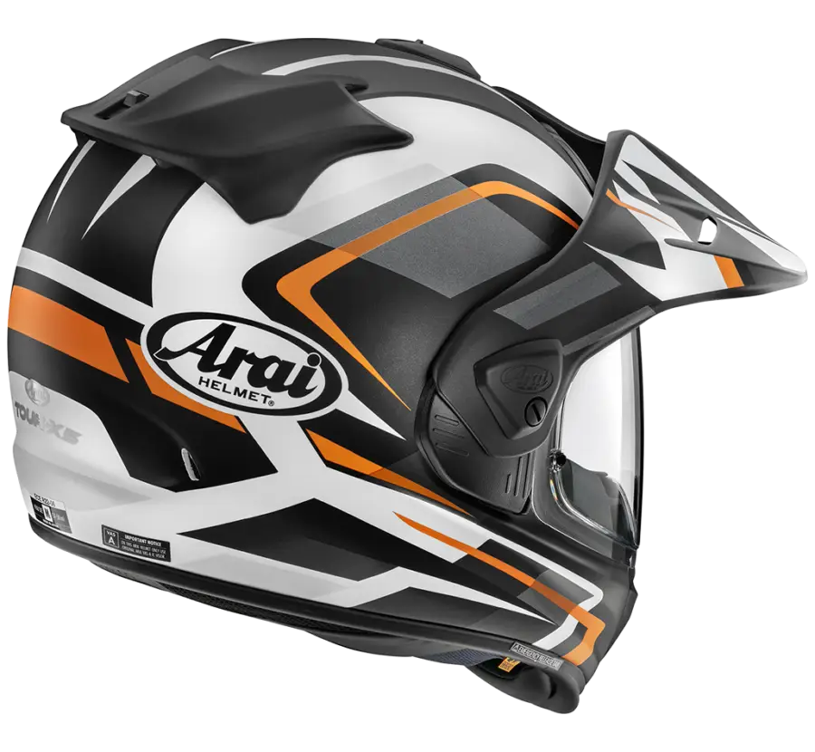• en Casque de moto Arai Tour-X5 Discovery en orange mat avec visière amovible, prêt pour l'aventure.