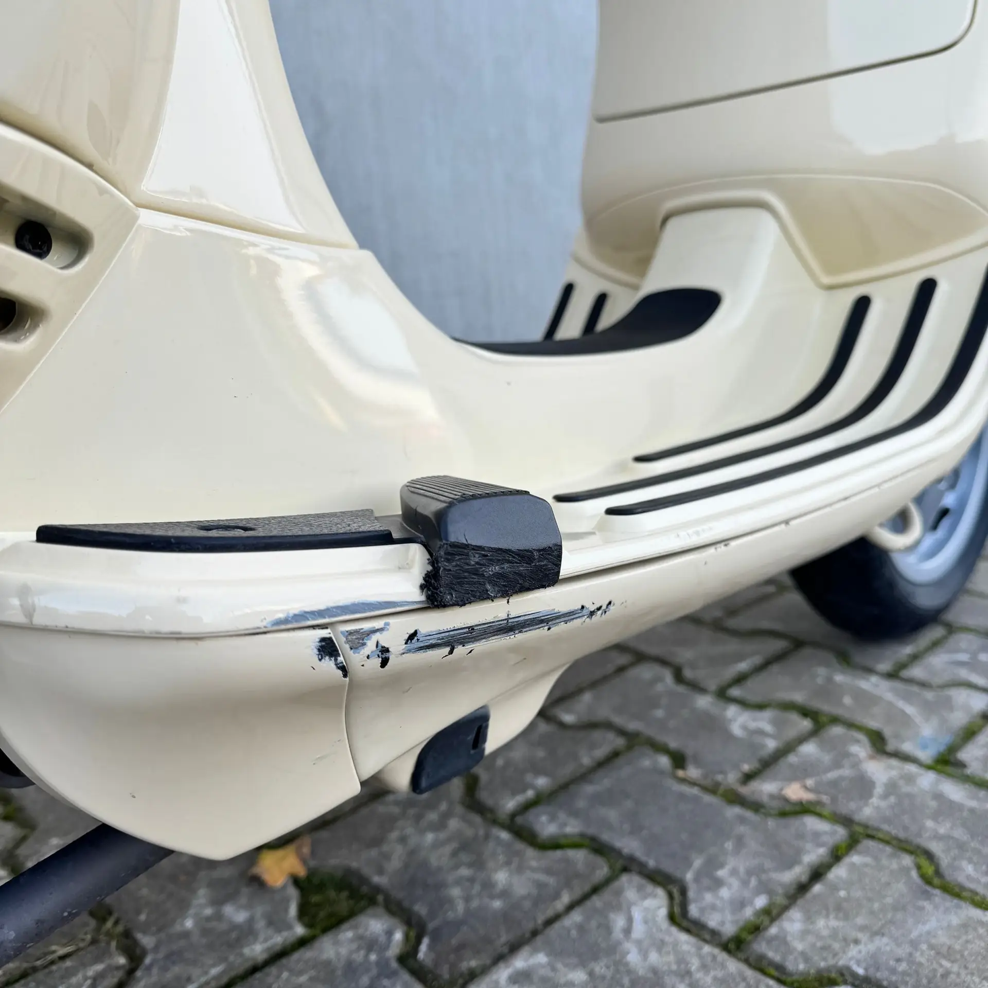 De scooter heeft lichte gebruiker sporen: Schade aan het rechterzijscherm, onderscherm en voetstep (zie foto’s). Deze schade kan tegen een meerprijs worden hersteld.